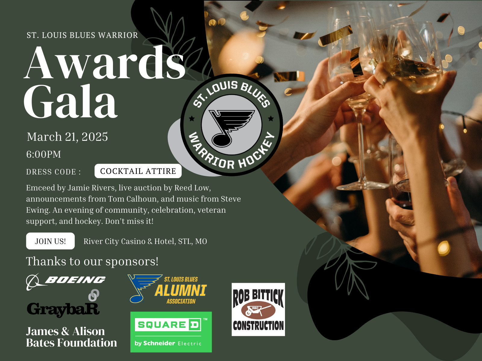 Join us for an unforgettable evening at the St. Louis Blues Warrior Awards Gala on March 21, 2025, at River City Casino & Hotel, starting at 6:00 PM. This special night will celebrate the dedication and achievements of our St. Louis Blues Warrior community.